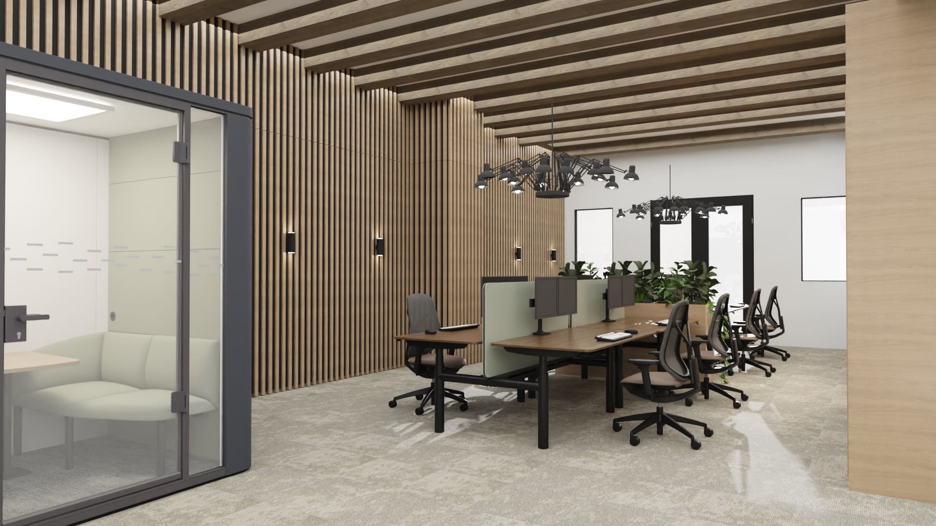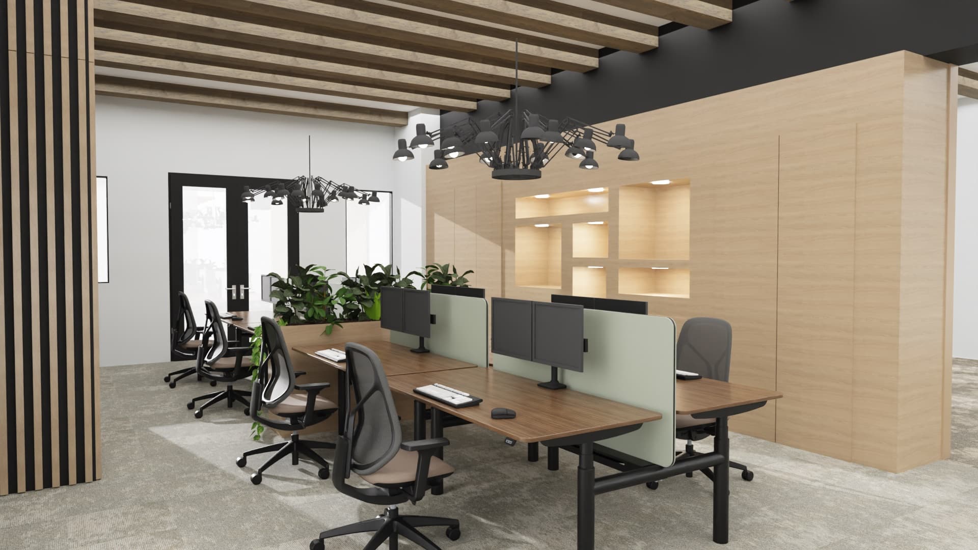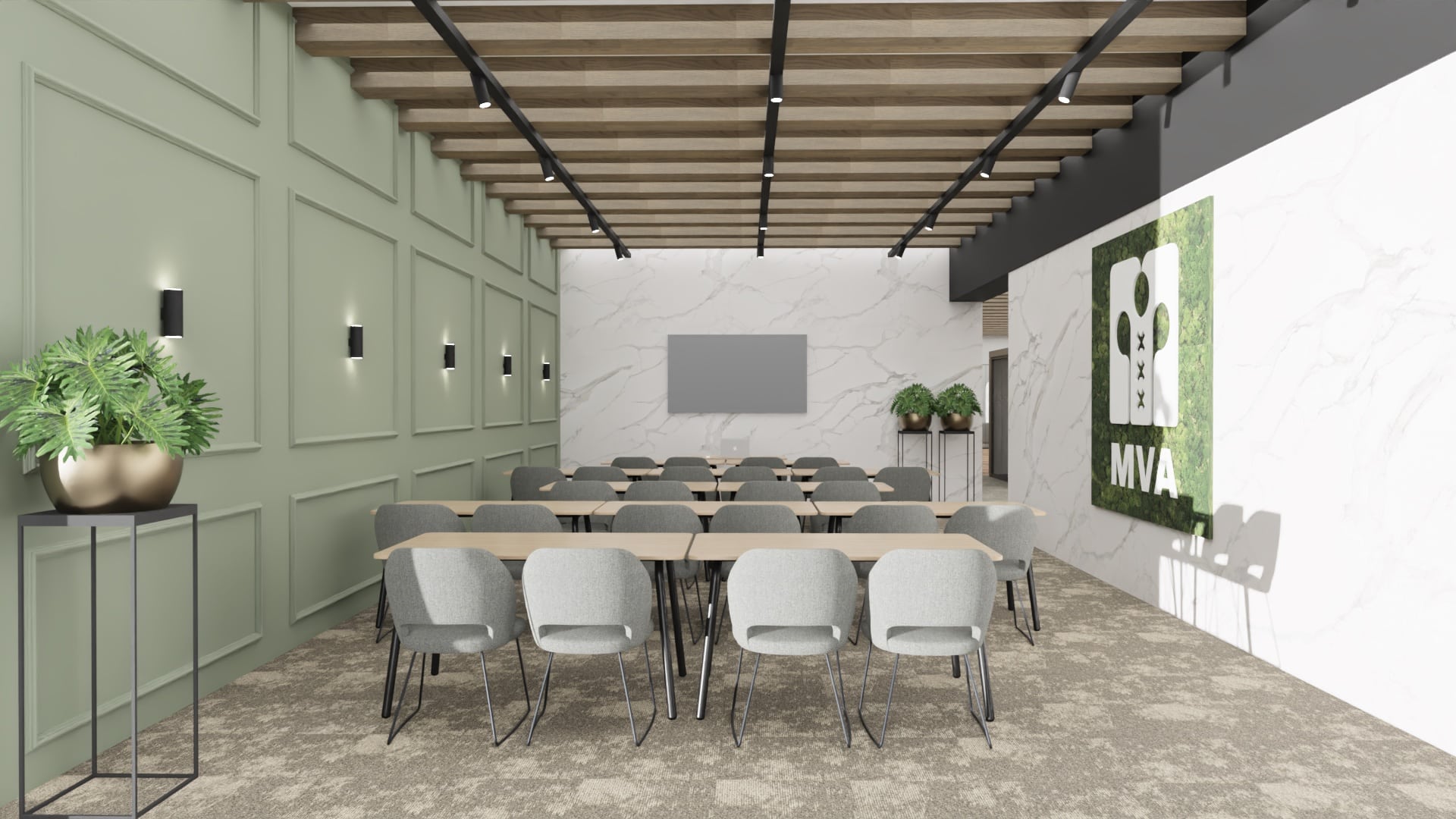Onze ontwerpstudio heeft hiervoor een prachtig ontwerp gemaakt in de stijl van een werkcafé waar de koffiebar de grote blikvanger is. Het kleurenpallet is een afgeleide van de op dit moment populaire Japandi stijl, een minimalistische functionele look met een warme en rustgevende uitstraling.