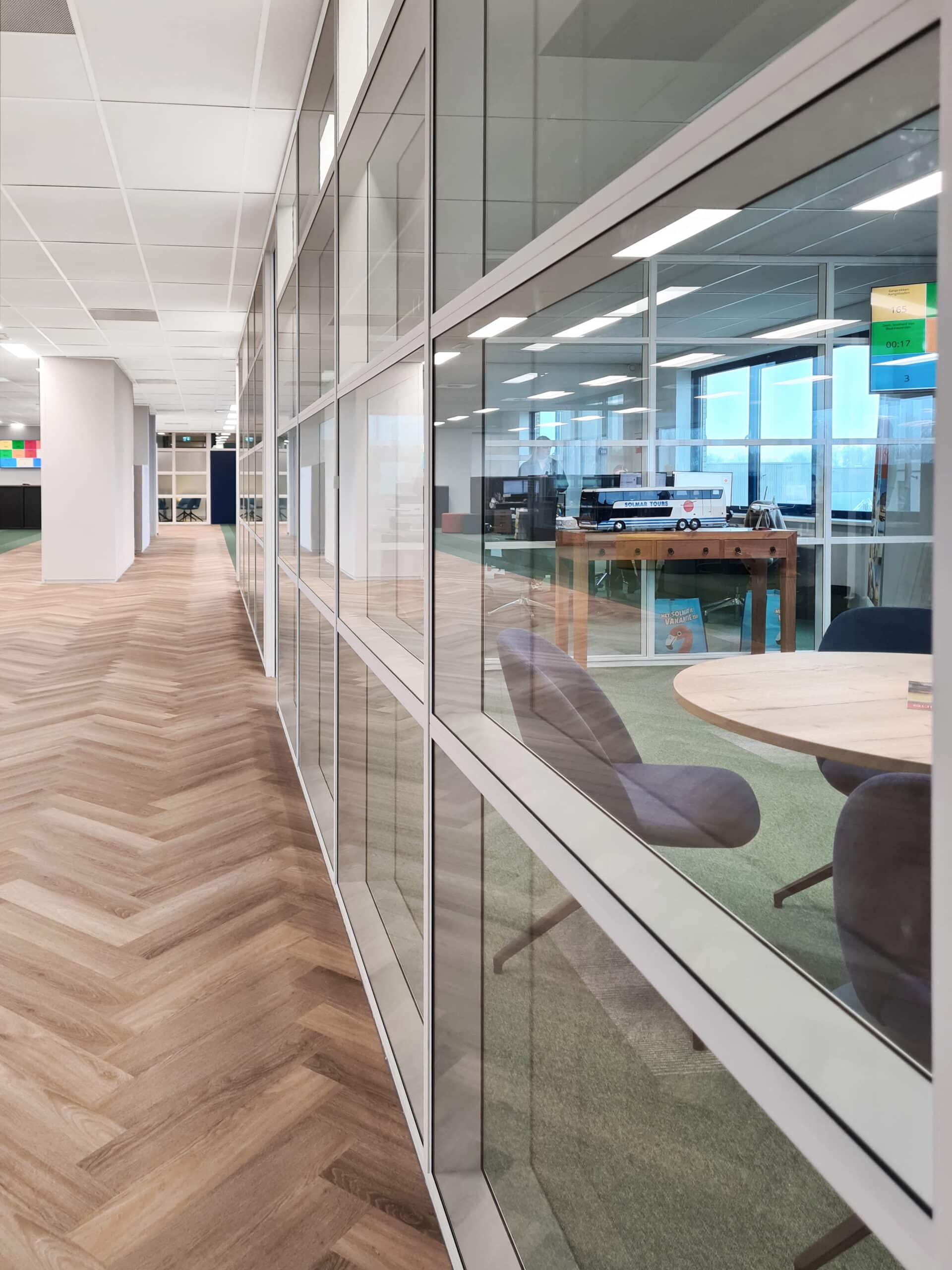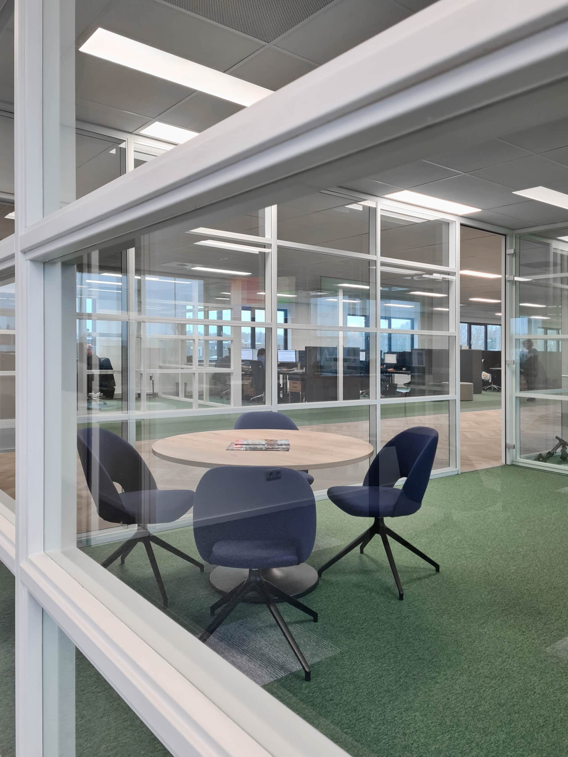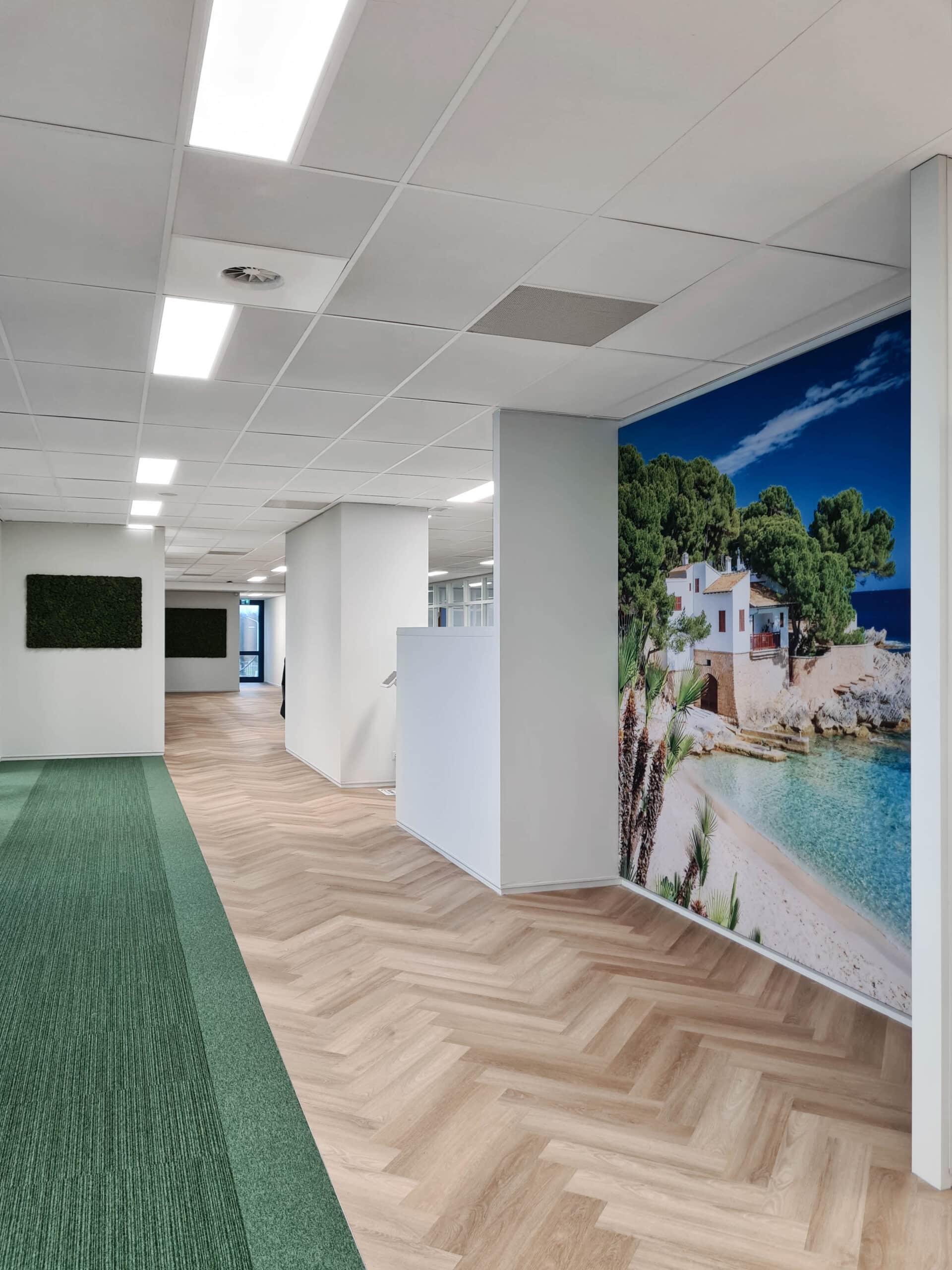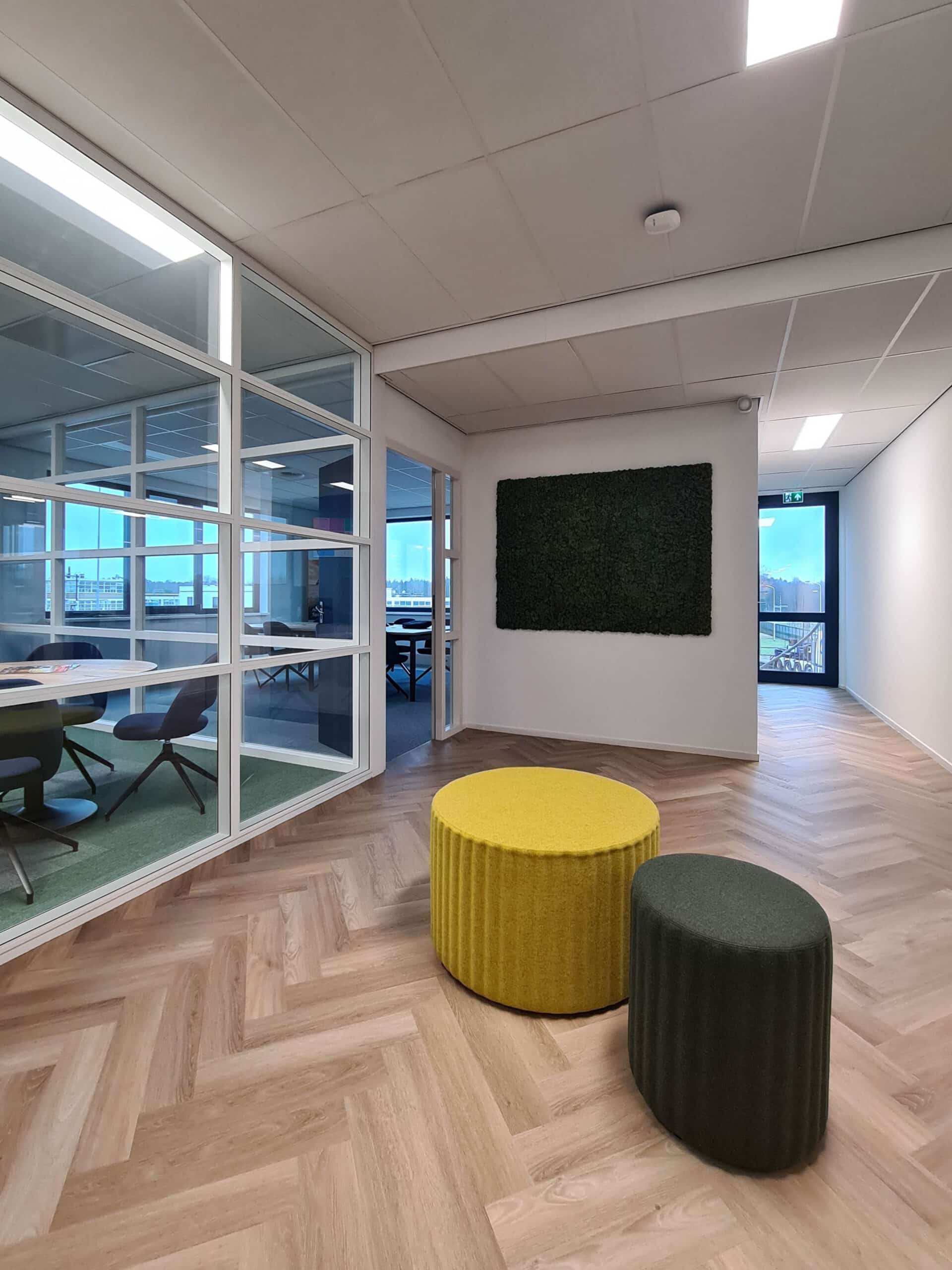 We hebben de huidige indeling aangepast en wat extra systeemwanden geplaatst passend bij de huidige witte houten glazen wanden. Hierdoor hebben we wat extra kantoren kunnen creëren. We hebben een nieuwe vloer gelegd met PVC stroken in visgraat motief. Dit in combinatie met een overlooptapijt in groen.